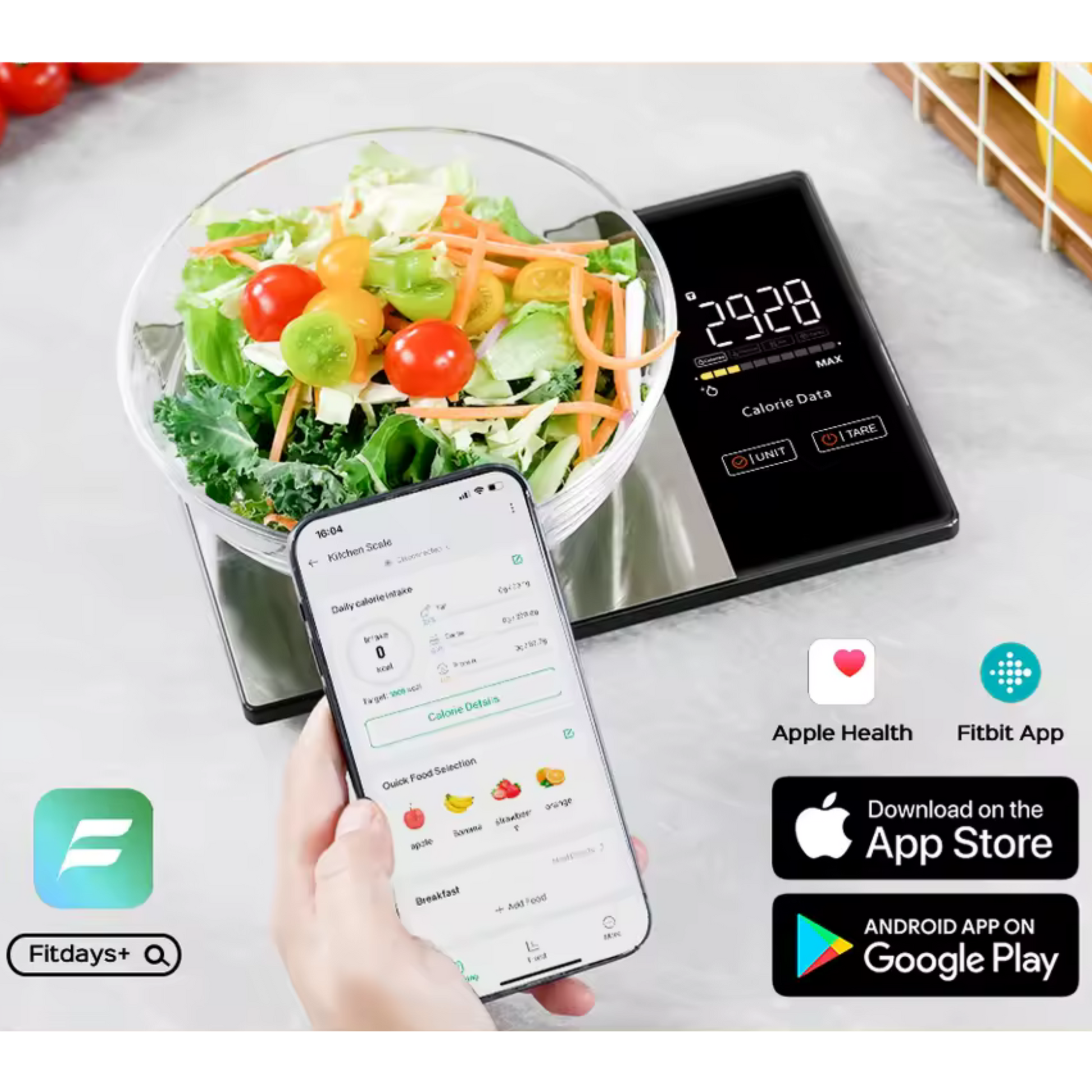 - App-Kompatibilität: Fitdays+, Apple Health, Fitbit, Google Fit